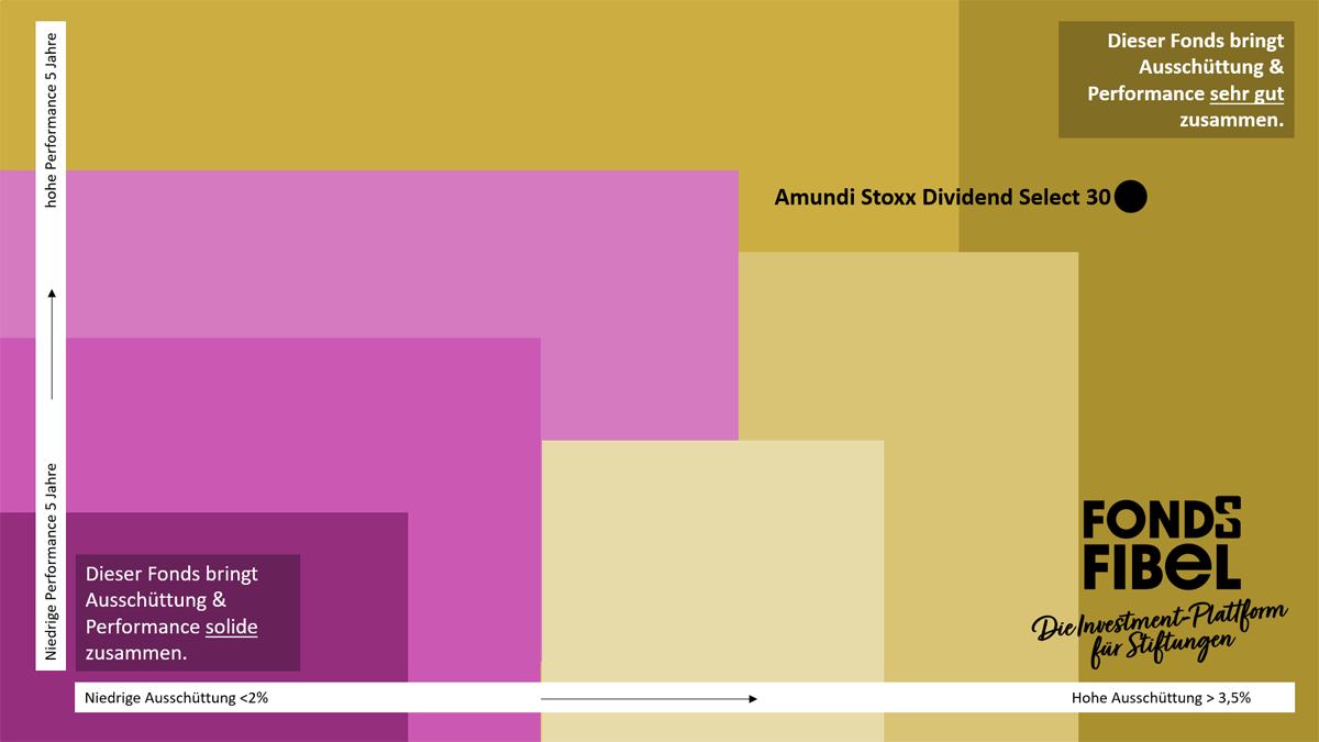Der Amundi Stoxx Europe Select Dividend 30 – UCITS ETF D ist ein kosteneffizienter ETF, der passiv die Performance des STOXX Europe Select Dividend 30 nachbildet. Im Gegensatz zu herkömmlichen stiftungsgeeigneten Fonds, die aktiv gemanagt werden, bringt das eine Strategie-Diversifikation ins Portfolio. Die knapp 20-jährige Ausschüttungshistorie trifft die Anforderungen von Stiftungen. Der Ansatz bietet Anlegern regelmäßige Ausschüttungen, ohne in aktive Titelselektion zu gehen. Das Verhältnis von Dividende zu Gewinn pro Aktie (EPS) ist bei der Zusammenstellung des Index nach oben gedeckelt, um sicherzustellen, dass die Dividenden aus den Gewinnen finanziert werden. Dieser Wert darf in der Regel maximal 60 % (bei Neuzugängen) betragen. Risiken sind einerseits klassisch aktiengetrieben (mittleres Risiko, SRRI 4), Nutzung effizienter Swap‑Replikation; die laufenden Kosten sind mit ca. 0,30 % p.a. sehr günstig. Empfohlener Anlagehorizont: rund 5 Jahre. Mit einer Risikoklasse von 4 (von 7) eignet sich der ETF für Anleger mit mittelfristigem bis langfristigem Anlagehorizont, die moderate Marktschwankungen akzeptieren.